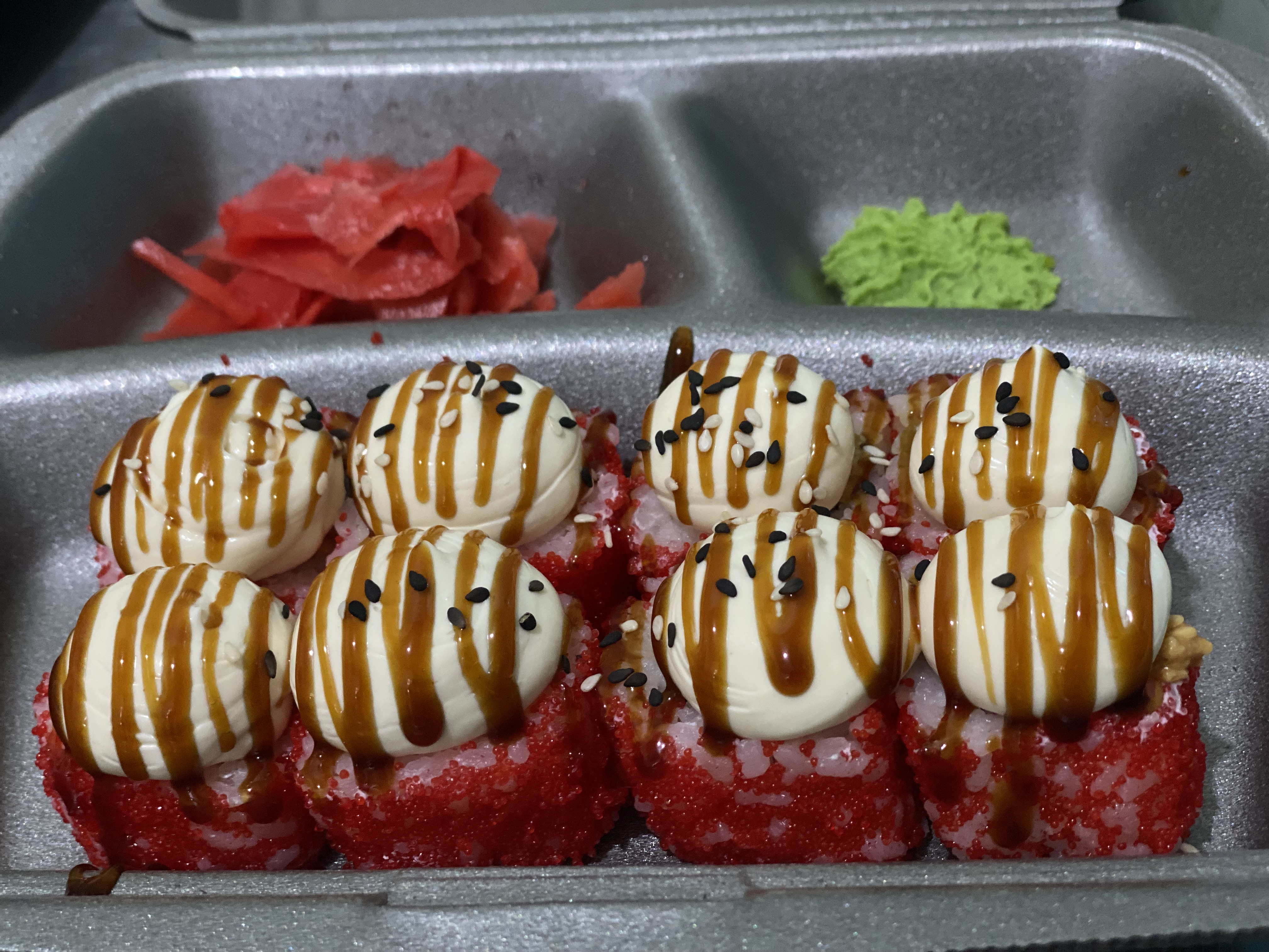 Состав: Рис,Нори,Огурец,сыр,лосось,терияки,икра.