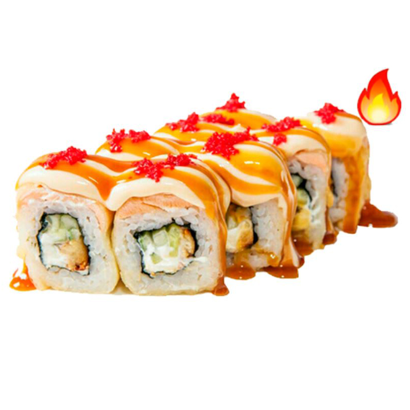 Состав: Рис,Нори,Огурец,сыр,лосось,терияки,икра.